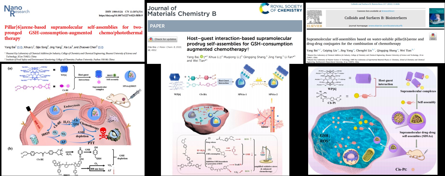 主客體識(shí)別作用可利用主體大環(huán)分子與功能客體分子間的非共價(jià)作用實(shí)現(xiàn)動(dòng)態(tài)/可逆的包合和解包合,是超分子領(lǐng)域的研究熱點(diǎn)。而主客體作用與兩親作用的結(jié)合,可構(gòu)筑具有合適尺度的超分子納米載體,實(shí)現(xiàn)腫瘤微環(huán)境響應(yīng)(酸性pH、高氧化還原水平、乏氧等)的高效精準(zhǔn)治療?;谌肼氷兛拼蠛蟮南嚓P(guān)研究基礎(chǔ)(Carbohydrate Polymers. 2020, 246, 116654;Carbohydrate Polymers. 2020, 231,115714;Macromolecules. 2020,53,4255-4263;Polymer Chemistry. 2020,11, 5810-5818;Carbohydrate Polymers. 2019, 213, 411-418;Chemistry-an Asian Journal. 2018, 13, 3903-3911;Chinese Journal of Polymer Science, 2018, 36, 406-416),化學(xué)與化工學(xué)院白陽(yáng)副教授近期開(kāi)展了一系列基于主客體識(shí)別作用的超分子治療體系研究,并取得了階段性研究成果。