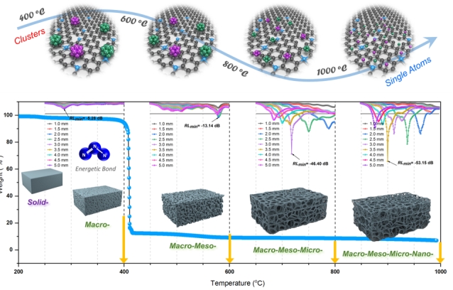 黃文歡課題組與復(fù)旦大學(xué)車仁超教授合作設(shè)計(jì)低CoFe含量的含能MOF(金屬三氮唑)前驅(qū)體,通過三氮唑400度左右的“爆炸”反應(yīng)可以成功合成具有超低金屬負(fù)載、超低密度的具有多級孔結(jié)構(gòu)的CoFe摻雜三維碳海綿材料。實(shí)現(xiàn)對金屬原子級分散、材料介電性能、耦合性能、阻抗匹配等的可控調(diào)控。