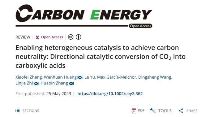 X. Zhang,W. Huang*,L. Yu, M. García-Melchor, D. Wang, L. Zhi* and H. Zhang* Enabling Heterogeneous Catalysis to Achieve Carbon Neutrality: Directional Catalytic Conversion of CO2into Carboxylic Acids,Carbon Energy,2023,e362.(2022影響因子:20.5)