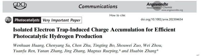 W. Huang, C. Su, C. Zhu, T. Bo, S. Zuo, W. Zhou, Y. Ren, Y. Zhang, J. Zhang, M. Rueping*, H. Zhang*,Isolated Electron Trap-Induced Charge Accumulation for Efficient Photocatalytic Hydrogen Production,Angew Chem., Int. Ed.,2023, e202304634.(VIP paper)(2022影響因子:16.6)
