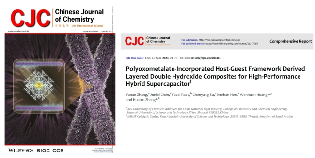 Y. Zhang, J. Chen, F. Razq, C. Su, X. Hou,W. Huang*,and H. Zhang*, Polyoxometalate-incorporated host-guest framework derived layered double hydroxide composites for high-performance hybrid supercapacitor,Chinese Journal of Chemistry,2023,41, 75-82.(雜志封面Outside Front Cover)(2022影響因子:5.4)