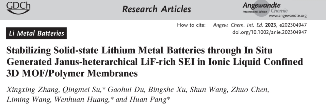 X. Zhang, Q. Su*, G. Du, B. Xu, S. Wang, Z. Chen, L. Wang,W. Huang*, H. Pang*, Stabilizing Solid-state Lithium Metal Batteries through In Situ Generated Janus-heterarchical LiF-rich SEI in Ionic Liquid Confined 3D MOF/Polymer Membranes,Angew Chem. Int. Ed.,2023, e202304947.(2022影響因子:16.6)
