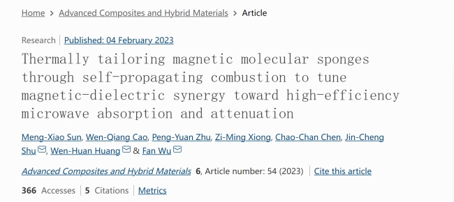 M. Sun, W. Cao, P. Zhu, Z. Xiong, C. Chen, J. Shu*,W. Huang*, Fan Wu*, Thermally tailoring magnetic molecular sponges through self-propagating combustion to tune magnetic-dielectric synergy towards high-efficiency microwave absorption and Attenuation,Advanced Composites and Hybrid Materials,2023, 6: 54.(2022影響因子:20.1)