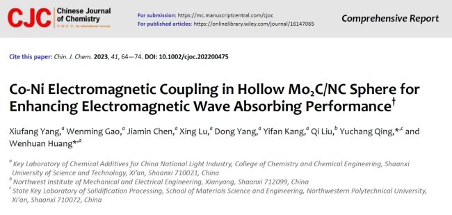 X. Yang, W. Gao, J. Chen, X. Lu, D. Yang, Y. Kang, Q. Liu, Y. Qing, andW. Huang*, Co-Ni Electromagnetic Coupling in Hollow Mo2C/NC Sphere for Enhancing Electromagnetic Wave Absorbing Performance,Chinese Journal of Chemistry,2023, 41, 64-74.(邀稿,2022影響因子:5.4)