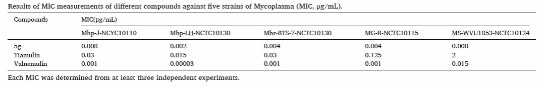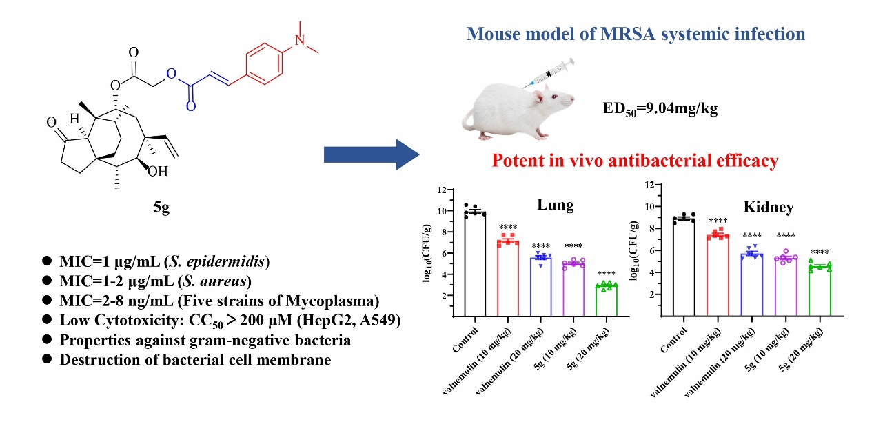 耐藥菌株的出現(xiàn)對傳統(tǒng)抗生素提出了嚴(yán)峻挑戰(zhàn),凸顯了探索新型抗菌藥物的迫切性,據(jù)國家兒童醫(yī)學(xué)中心、首都醫(yī)科大學(xué)在我國新近流行的支原體肺炎感染中,耐藥支原體對大環(huán)內(nèi)酯類藥物的耐藥率已達(dá)到90%,由于四環(huán)素類和喹諾酮類藥物在兒童和青少年人群中的用藥限制,兒童支原體肺炎患者亟需安全有效的抗支原體肺炎藥物。梁承遠(yuǎn)教授聯(lián)合新疆醫(yī)科大學(xué)藥學(xué)院李敏團(tuán)隊(duì)、盤龍藥業(yè)設(shè)計(jì)合成一系列截短側(cè)耳素芳香丙烯酸酯衍生物,并對這些截短側(cè)耳素衍生物的抗菌活性、抗支原體活性進(jìn)行了評價(jià),多數(shù)衍生物對革蘭氏陽性菌和革蘭氏陰性菌均表現(xiàn)出中等至優(yōu)異的抗菌活性。其中,化合物5g抗菌活性最強(qiáng),其MIC值為1~32μg/mL,對臨床分離耐藥菌株的MIC值為4~64μg/mL。5g對5株支原體表現(xiàn)出優(yōu)異的活性,MIC值在2至8ng/mL圍內(nèi),優(yōu)于已上市藥物沃尼妙林(MICs=0.03–2μg/mL)。此外,5g表現(xiàn)出極低的細(xì)胞毒性以及擾亂細(xì)菌細(xì)胞膜的傾向。5g可提高M(jìn)RSA感染小鼠的存活率,ED50為9.04 mg/kg。這些結(jié)果表明5g可進(jìn)一步開發(fā)為抗菌藥物、抗支原體藥物,用于臨床治療耐藥菌感染及支原體感染。該成果發(fā)表于《European Journal of Medicinal Chemistry》上,李敏(第一作者)、梁承遠(yuǎn)教授為文章共同通訊作者,盤龍藥業(yè)謝曉林、張德柱為文章共同作者。全文鏈接:https://doi.org/10.1016/j.ejmech.2023.115653。