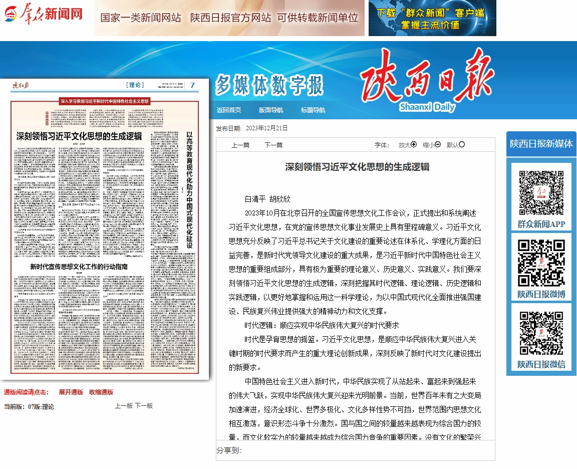 近日,《陜西日報》刊發(fā)我校馬克思主義學院白清平教授理論文章《深刻領(lǐng)悟習近平文化思想的生成邏輯》。