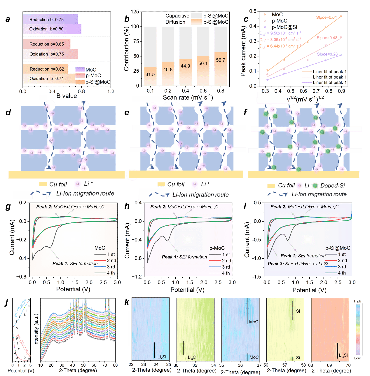 要點(diǎn)三:p-Si@MoC材料促進(jìn)鋰離子快速動(dòng)力傳輸及原位儲(chǔ)鋰機(jī)制