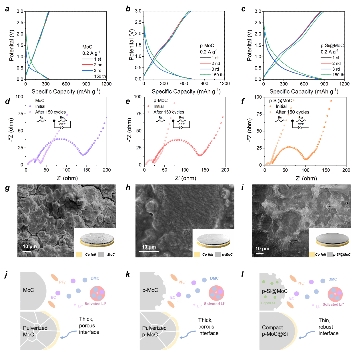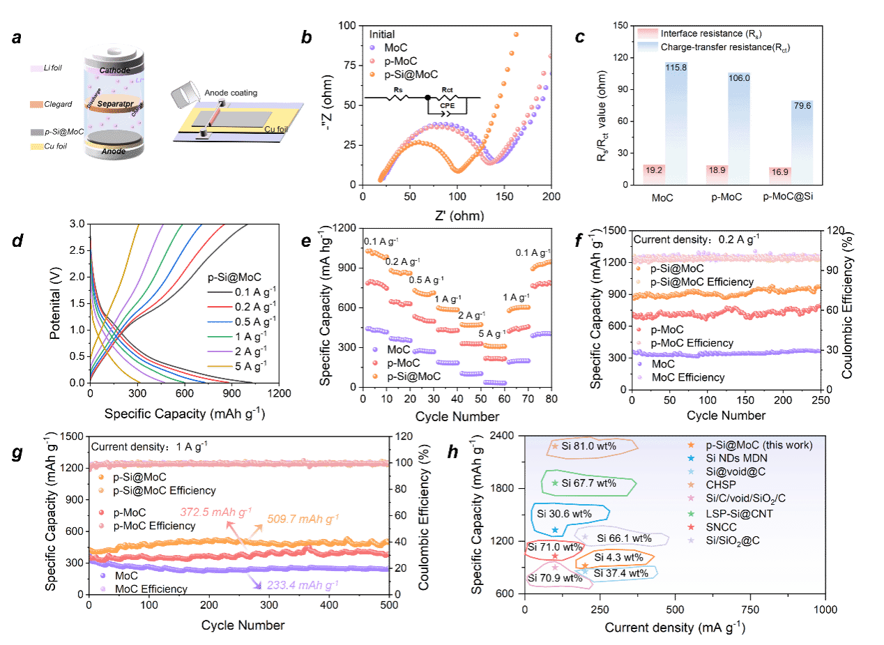作為鋰離子電池負(fù)極材料,p-Si@MoC展現(xiàn)出了極小的電極/電解質(zhì)界面阻抗(Rs)和電荷轉(zhuǎn)移阻抗(Rct)。值得注意的是,優(yōu)化后p-Si@MoC負(fù)極在250次循環(huán)后顯示976.6 mAh g-1的放電容量,而p-MoC在250次循環(huán)后的放電容量為800.6 mAh g-1。根據(jù)p-Si@MoC中Si的含量(4.3 wt%)計(jì)算出硅的理論容量為180.6 mAh g-1。因此,我們認(rèn)為這種獨(dú)特的多孔結(jié)構(gòu)可以最大限度地利用Si摻雜來(lái)提高容量,且Si的容量利用率可達(dá)97.5%。