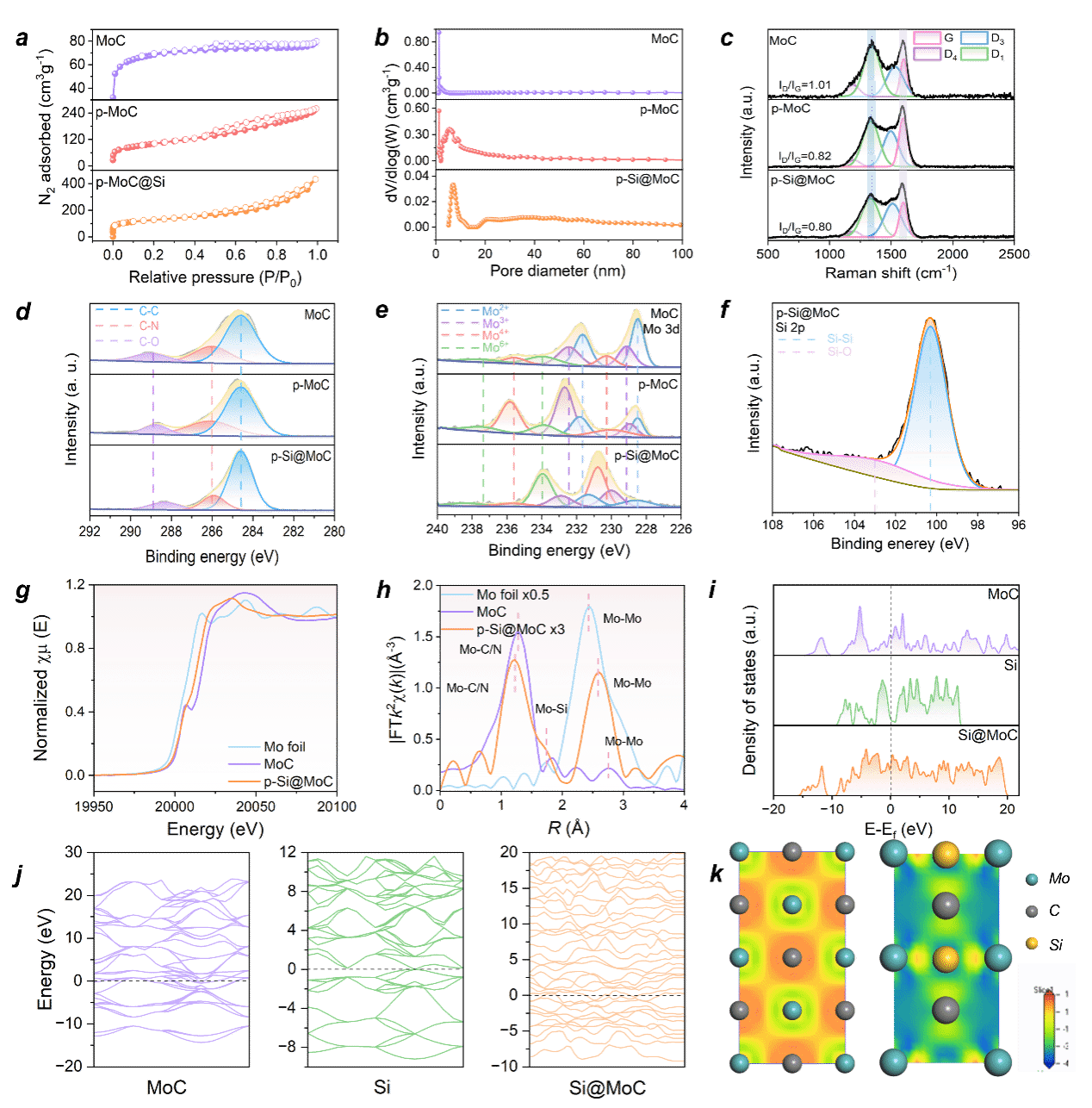 通過(guò)X射線近邊吸收光譜(XANES)和擴(kuò)展X射線吸收精細(xì)結(jié)構(gòu)譜(EXAFS),驗(yàn)證了Si摻雜在MoC基體中形成的Mo-Si鍵。通過(guò)密度泛函理論(DFT)的計(jì)算,揭示了多孔Si@MoC優(yōu)異的電導(dǎo)率和電子傳遞能力。