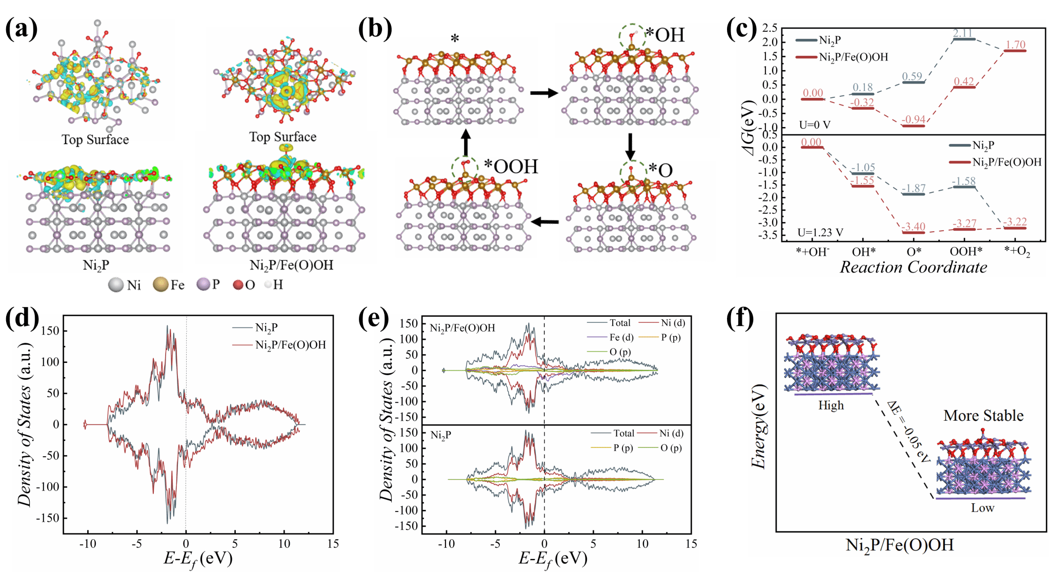 DFT計(jì)算進(jìn)一步研究了非均相界面與催化性能之間的關(guān)系。Fe(O)OH的存在導(dǎo)致了局部電荷密度的重新分布。靠近O原子的Fe原子表現(xiàn)出明顯的電子積累,這意味著Ni和Fe之間的快速電子轉(zhuǎn)移可以有效地加速OOH*的形成,降低速率決定步驟的活化能。同時(shí)從PDOS中可以看出,O 2p帶和Ni d帶中心之間的能量差為正。因此,Ni2P中的金屬中心更有利于貢獻(xiàn)電子,推動(dòng)OER發(fā)生,有利于傳統(tǒng)的AEM路徑。而對(duì)于Ni2P/Fe(O)OH, Fe d帶和O 2p帶明顯重疊,表明金屬位和氧配體的共價(jià)雜化增強(qiáng)。這將導(dǎo)致吸附-催化劑界面上更快的電子轉(zhuǎn)移,并促進(jìn)LOM機(jī)制。這些清楚地表明Ni2P/Fe(O)OH的OER活性增強(qiáng)是由于Ni2P和Fe(O)OH在OER過程中通過優(yōu)化形貌、調(diào)節(jié)電子結(jié)構(gòu)和降低中間體ΔG協(xié)同作用的結(jié)果。Ni2P/Fe(O)OH-40/NF對(duì)OER也具有長(zhǎng)期穩(wěn)定性,同時(shí)在堿性條件下OER過程中金屬磷化物會(huì)轉(zhuǎn)化為氧化物和(氧)氫氧化物,并且表明表面(氧)氫氧化物是OER真正的電化學(xué)活性物質(zhì)。
