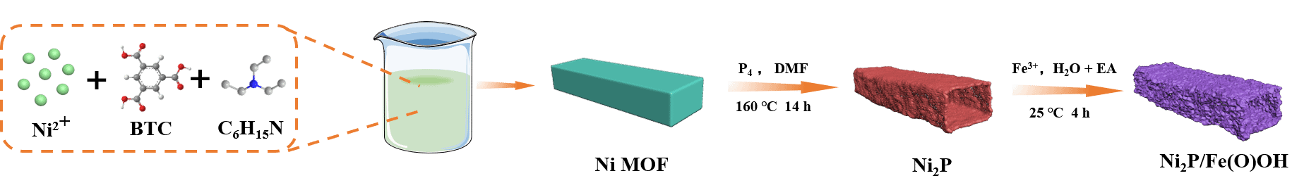 隨著人們對(duì)化石燃料過度消費(fèi)導(dǎo)致環(huán)境問題的日益關(guān)注,氫作為能源載體成為最有希望的替代能源。水電解制氫被認(rèn)為是大規(guī)模獲得高純氫氣最適用的技術(shù)。然而,陽(yáng)極析氧反應(yīng)(OER)是一個(gè)復(fù)雜且動(dòng)力學(xué)緩慢的四電子轉(zhuǎn)移過程,長(zhǎng)期以來(lái)一直是水電解的主要瓶頸。富金屬磷化鎳相具有高導(dǎo)電性和豐富的電催化位點(diǎn),可在堿性溶液中有效催化OER。然而,如何有效地增加電催化活性位點(diǎn)的數(shù)量,降低羥基(ΔGOH*)在Ni位點(diǎn)的吸附能,進(jìn)一步提高電催化OER活性仍是一個(gè)挑戰(zhàn)。Fe(O)OH環(huán)保且成本低,但其電催化OER活性較差,受限于Fe位點(diǎn)上的低電導(dǎo)率和羥基吸附較弱。然而,F(xiàn)e位點(diǎn)上的弱吸附使得調(diào)節(jié)相鄰Ni位點(diǎn)上氧合物質(zhì)的吸附能成為理想選擇,形成異質(zhì)結(jié)構(gòu)可以增強(qiáng)表面親水性,改變表面活性位點(diǎn)的電子結(jié)構(gòu)和化學(xué)環(huán)境,改變界面雙層結(jié)構(gòu),中斷界面水偶極子排列。這些因素可導(dǎo)致OER催化活性增強(qiáng)。因此,Ni2P/Fe(O)OH異質(zhì)結(jié)構(gòu)有望實(shí)現(xiàn)高效的電催化OER活性,對(duì)未來(lái)水電解制氫的廣泛應(yīng)用至關(guān)重要。