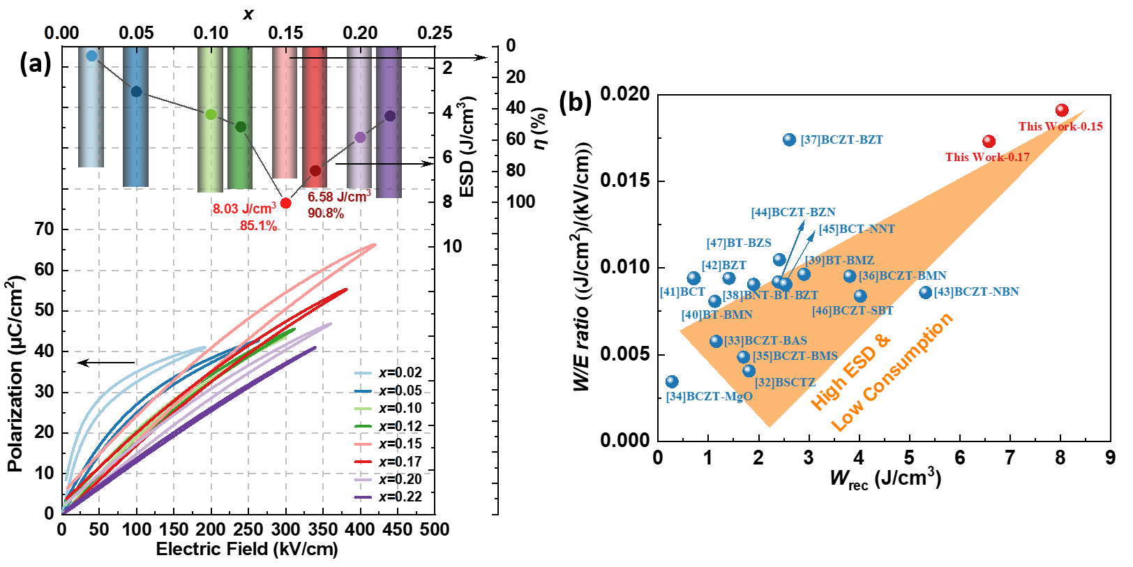 (a) P-E loops of BCZT-xBZT ceramics with corresponding energy storage performances; (b) Comparison of the Wrec and W/E ratio between BCZT-xBZT with x=0.15 and 0.17 in our work and some typical BZT-based ceramics