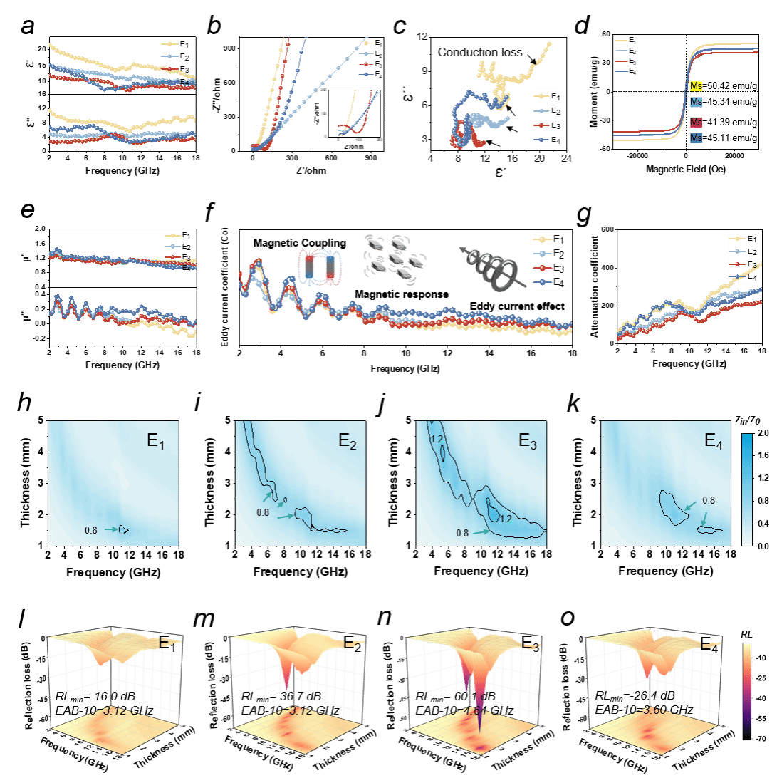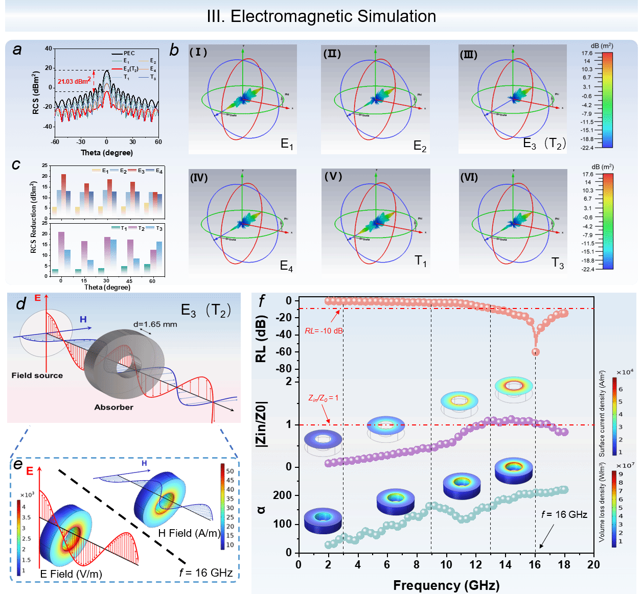 3. 對于電磁波的傳導及耗散機理,通過COMSOL仿真軟件模擬了不同頻率下的動態(tài)損耗過程,揭示了電磁波的阻抗特性與原位衰減過程。深入解釋了阻抗匹配和衰減能力在電磁波吸收中的作用機制。