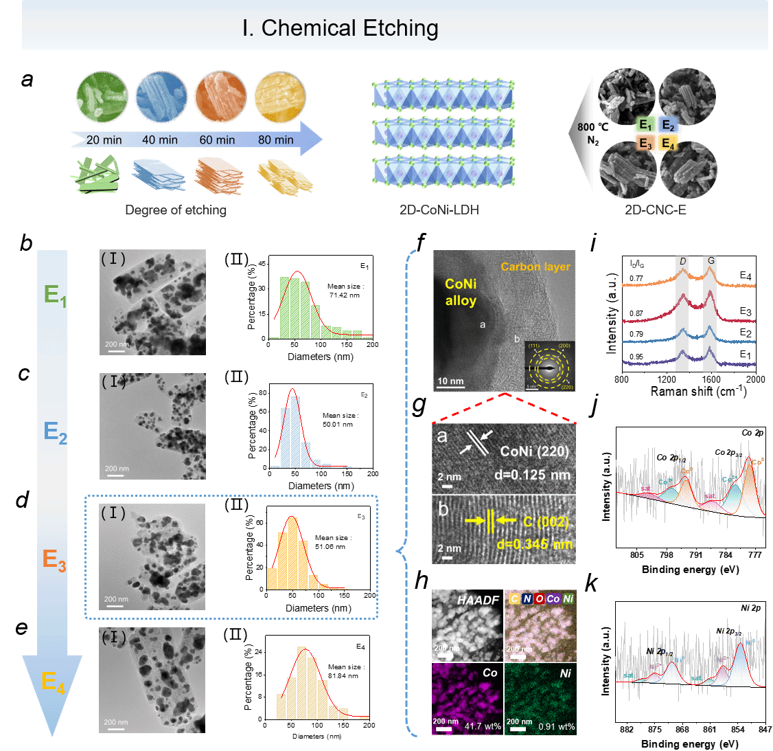 1.設(shè)計了“兩步氧化還原”策略,利用咪唑酸鈷硼骨架(Co-BIF)為前驅(qū)體,通過改變2D-CNC-Ex(x=1、2、3和4分別表示20、40、60和80 min)的化學氧化刻蝕時間,實現(xiàn)了阻抗特性的定制調(diào)控。進一步,調(diào)節(jié)2D-CNC-Tx的(x=1、2和3分別表示600、800和1000℃)煅燒還原溫度,通過原位顯微技術(shù)深入揭示材料內(nèi)部隨溫度變化的二維復合材料的結(jié)構(gòu)演變。