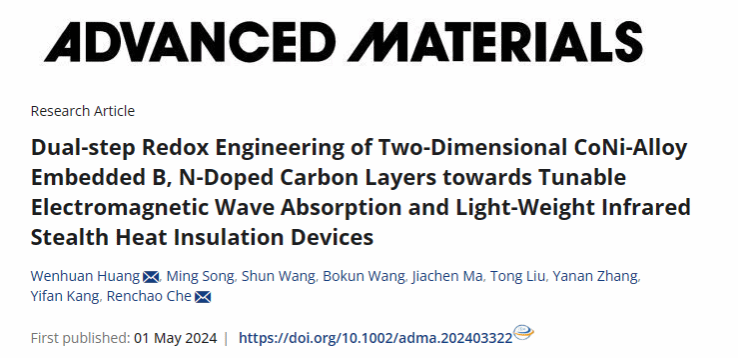 針對上述問題,近日,陜西科技大學化學與化工學院黃文歡教授團隊與復旦大學車仁超教授合作報道了一個兩步氧化還原法構(gòu)造高性能二維電磁波吸收材料及多功能器件的組裝方法,并通過原位顯微技術(shù)揭示了材料的結(jié)構(gòu)演化機制與電磁耦合協(xié)同機制。相關(guān)工作在《Advanced Materials》期刊上以“Dual-step Redox engineering of two-dimensional CoNi-alloy embedded B, N-doped carbon layers towards tunable electromagnetic wave absorption and light-weight infrared stealth heat insulation devices”為題發(fā)表。陜西科技大學為第一通訊單位,通訊作者為陜西科技大學黃文歡教授和復旦大學車仁超教授。