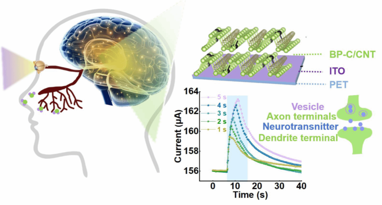 傳統(tǒng)計算機(jī)采用的馮·諾依曼架構(gòu)體系處理器與內(nèi)存在物理上是分離的,使得計算機(jī)內(nèi)數(shù)據(jù)運(yùn)算需要消耗大量的時間和功耗。而人腦在實(shí)現(xiàn)高速并行運(yùn)算的同時也能保持超低的功耗,這是因?yàn)槿祟惔竽X不僅能夠處理單模態(tài)感官輸入,還能通過初級感覺區(qū)的神經(jīng)元整合多感官信息。鑒于此,開發(fā)模仿人類感官(眼睛、耳朵、鼻子、舌頭和皮膚)的神經(jīng)形態(tài)設(shè)備,實(shí)現(xiàn)多模態(tài)感官整合和神經(jīng)生物學(xué)行為,對于實(shí)現(xiàn)神經(jīng)形態(tài)、感知、計算以及彌合人工智能和自然智能之間的鴻溝具有重要意義。其中,基于憶阻器的人工突觸設(shè)備在學(xué)習(xí)、分類、識別、感知、信息存儲和神經(jīng)網(wǎng)絡(luò)模擬等復(fù)雜任務(wù)具有明顯優(yōu)勢。二維(2D)層狀黑磷(BP)因其獨(dú)特光電特性,如可調(diào)帶隙、高載流子遷移率和高吸收系數(shù),成為光電和嗅覺突觸器件的理想選擇。但BP環(huán)境不穩(wěn)定性阻礙了其在突觸器件領(lǐng)域的發(fā)展。為解決此問題,通過碳原子摻雜,并與一維(1D)碳納米管(CNTs)結(jié)合構(gòu)建BP-C/CNTs范德華異質(zhì)結(jié)構(gòu),利用BP-C納米片和CNTs之間的協(xié)同效應(yīng),促進(jìn)電子轉(zhuǎn)移,提高輸運(yùn)效率和結(jié)構(gòu)穩(wěn)定性。