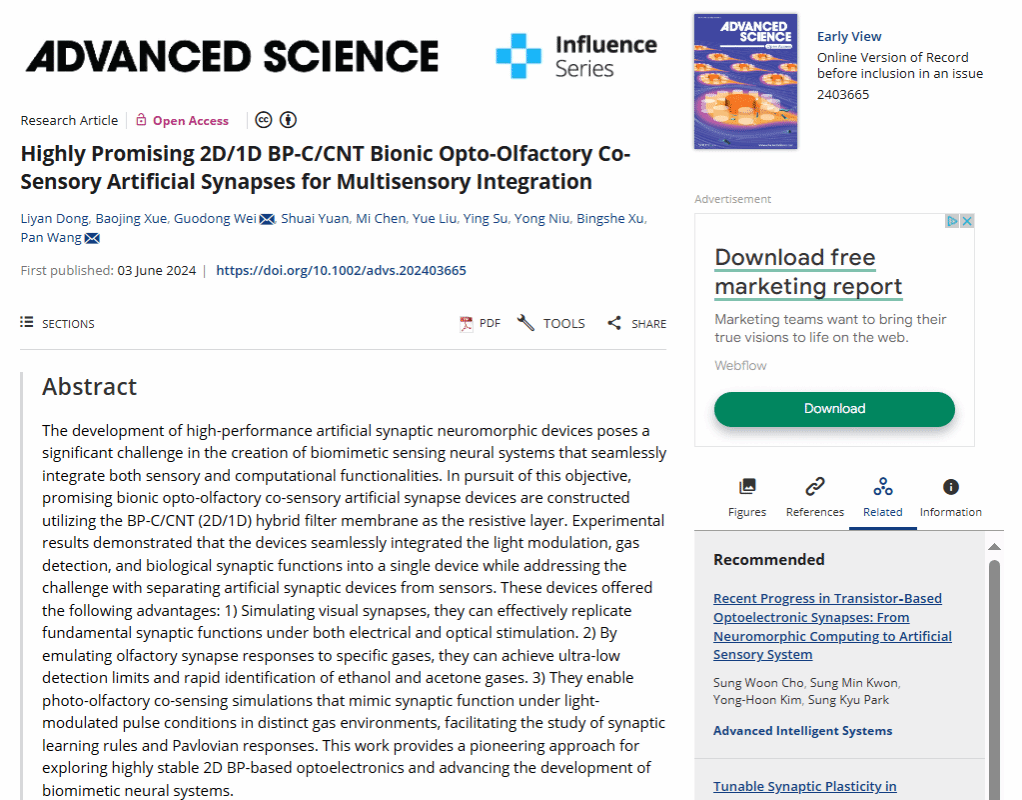 近期,物理與信息科學(xué)學(xué)院材料原子分子科學(xué)研究所許并社領(lǐng)導(dǎo)的認(rèn)知材料團(tuán)隊尉國棟教授小組青年教師王盼在著名國際學(xué)術(shù)期刊《Advanced Science》上發(fā)表題為“Highly Promising 2D/1D BP-C/CNT Bionic Opto-Olfactory Co-Sensory Artificial Synapses for Multisensory Integration”的高水平論文。我校碩士研究生董李艷為第一作者,研究生薛寶靜為共同第一作者,尉國棟和王盼為共同通訊作者,陜西科技大學(xué)為唯一通訊單位。在這項(xiàng)研究中,該團(tuán)隊研究人員開發(fā)了基于BP-C/CNTs (2D/1D)異質(zhì)結(jié)構(gòu)濾膜的仿生光嗅覺共感人工突觸器件,集成了光調(diào)制、氣體檢測和生物突觸功能,模擬了多感覺神經(jīng)元特征。這項(xiàng)工作為研究多重感知人工突觸器件提供了一種新方法。該成果的發(fā)表體現(xiàn)了我校在黑磷多重感知人工突觸器件領(lǐng)域的影響力。