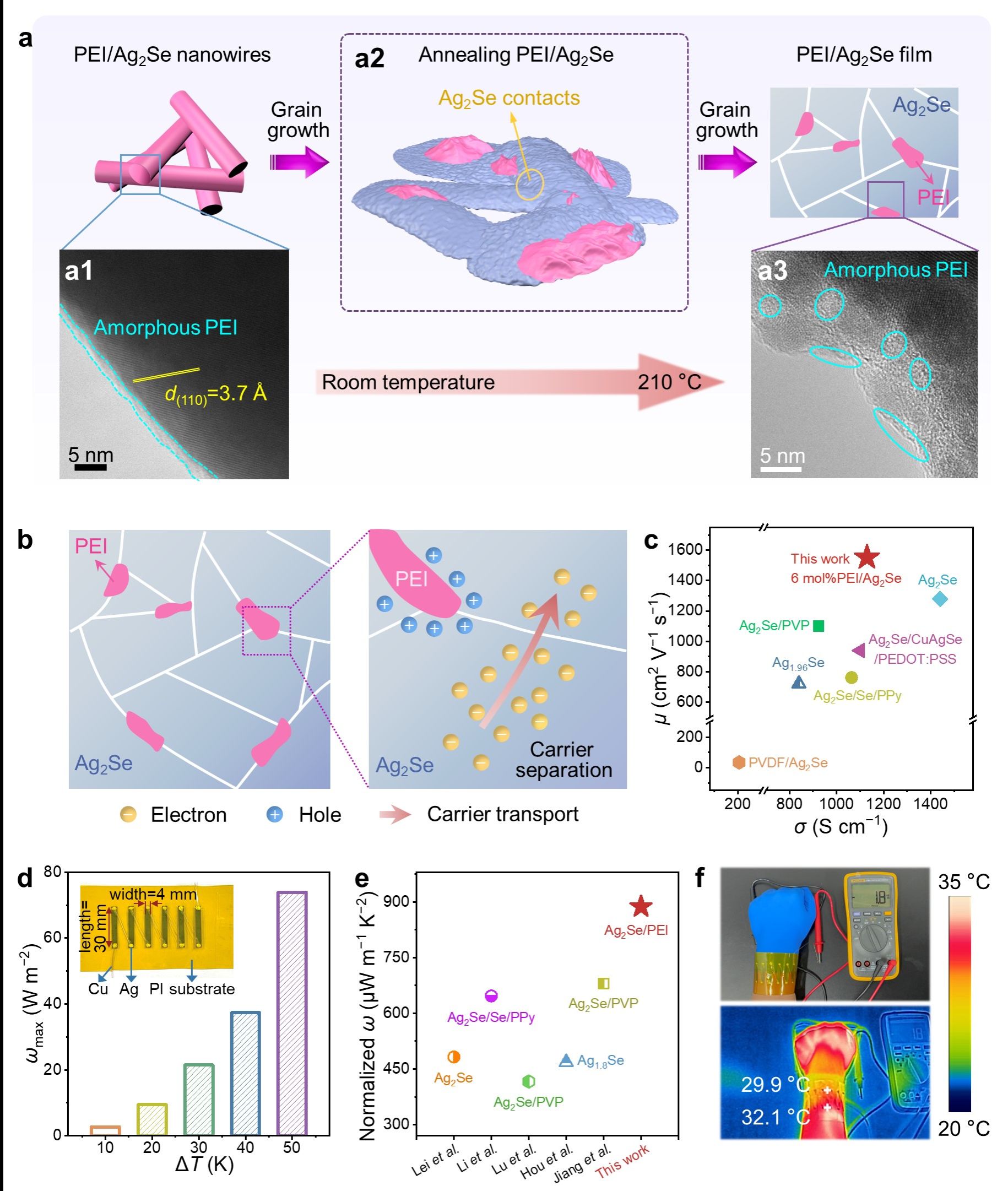 本項工①創(chuàng)新性的提出了一種載流子分離策略用于提升Ag2Se薄膜的電導(dǎo)率和功率因數(shù)。具體地,將絕緣電子供體聚乙烯亞胺(PEI)與Ag2Se復(fù)合, 其中PEI的不均勻分布可以吸引n型Ag2Se基體中的空穴,而分離的少數(shù)載流子基于庫侖斥力能夠避免對n型Ag2Se中電子顯著散射,進而優(yōu)化載流子遷移率,實現(xiàn)了Ag2Se基熱電薄膜創(chuàng)紀(jì)錄的載流子遷移率~1551.99 cm2 V?1 s?1和優(yōu)異的功率因子~22.39 W m?1 K?2;②該復(fù)合薄膜在6 mm彎曲半徑1000次彎曲后電阻僅降低了6.5 %,表現(xiàn)出優(yōu)異的柔性;③該復(fù)合薄膜組裝成的柔性熱電器件表現(xiàn)出優(yōu)異的歸一化功率密度~73.93 W m?2,遠(yuǎn)高于已報道的Ag2Se基熱電薄膜器件。