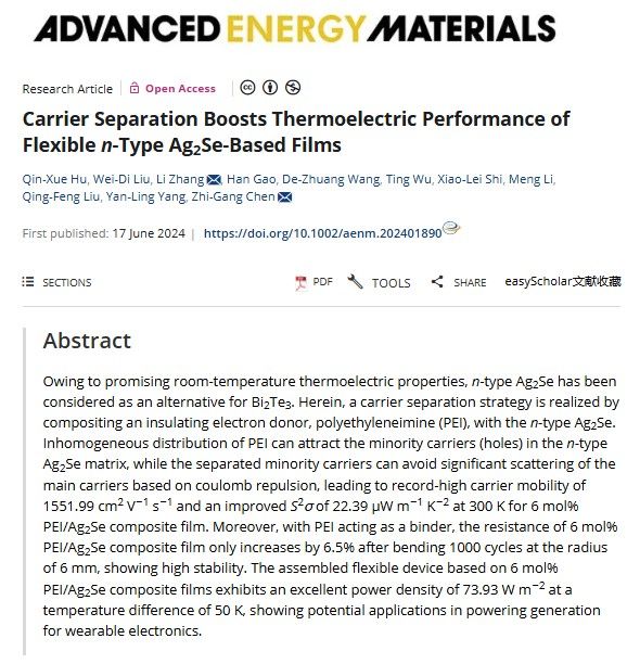 材料科學(xué)與工程學(xué)院(文物保護科學(xué)與技術(shù)學(xué)院)張荔副教授在Wiley雜志社旗下的國際著名學(xué)術(shù)期刊《Advanced Energy Materials》(IF:27.8)上發(fā)表題為“Carrier Separation Boosts Thermoelectric Performance of Flexible n-type Ag2Se-based Films”的高水平研究論文。我校張荔副教授、昆士蘭科技大學(xué)陳志剛教授為論文共同通訊作者,陜西科技大學(xué)為第一通訊單位。該論文的發(fā)表提高了我校在熱電能源轉(zhuǎn)換材料領(lǐng)域的國際影響力。