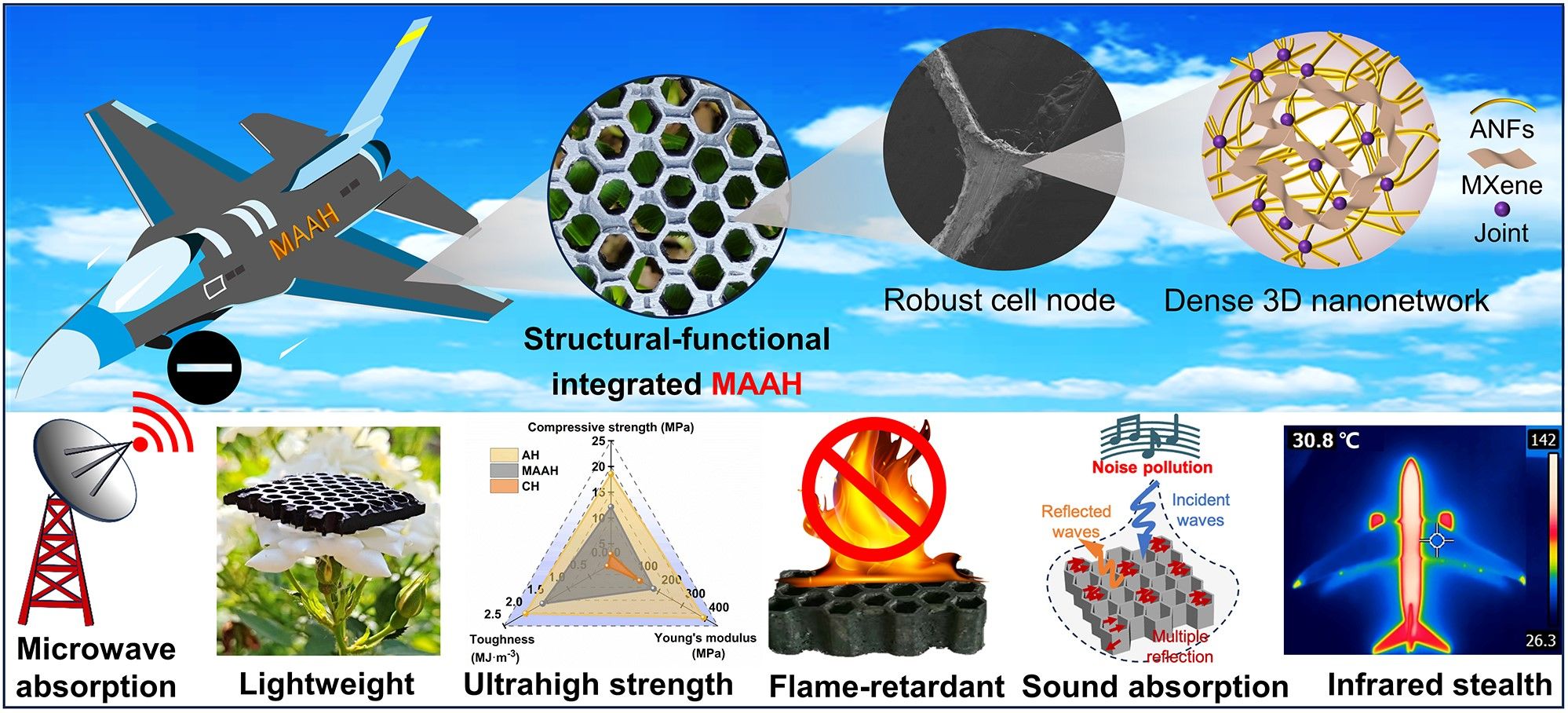 團(tuán)隊(duì)開發(fā)了一種納米雜化組裝策略制備了可擴(kuò)展、可回收、無樹脂的結(jié)構(gòu)功能一體化的芳綸蜂窩吸波(MAAH)材料。得益于芳綸納米纖維相互交織形成的一體化超強(qiáng)蜂窩節(jié)點(diǎn)設(shè)計(jì)以及致密的三維網(wǎng)絡(luò)結(jié)構(gòu),蜂窩的抗壓強(qiáng)度和韌性分別是商用芳綸蜂窩的6倍和25倍。更重要的是,MXene導(dǎo)電網(wǎng)絡(luò)與蜂窩的多孔結(jié)構(gòu)以及導(dǎo)電損耗、偶極和界面極化的協(xié)同作用使其具有優(yōu)異的吸波性能,在厚度僅為1.9 mm反射損耗最小值可以達(dá)到-38.5 dB,幾乎覆蓋了整個(gè)X波段。此外,MAAH還具有出色的紅外熱隱身、吸音性能和結(jié)構(gòu)完整性的實(shí)時(shí)監(jiān)測(cè)功能,在航空航天和軍事民用等領(lǐng)域具有廣闊的應(yīng)用前景。該研究“Functional-Structural Integrated Aramid Nanofiber?based Honeycomb Materials with Ultrahigh Strength and Multi?Functionalities”發(fā)表在《Advanced Fiber Materials》上。博士研究生孫浩為本文第一作者,楊斌副教授、張美云教授為通訊作者。