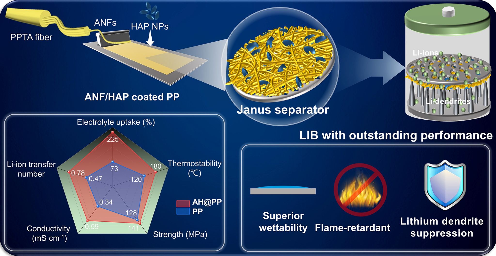 針對(duì)目前商業(yè)化的聚烯烴隔膜存在的熱穩(wěn)定性差、潤(rùn)濕性低、易被鋰枝晶刺穿等問題,導(dǎo)致鋰電池易發(fā)生熱失控和短路等安全隱患問題,利用芳綸納米纖維和羥基磷灰石納米顆粒作為主要構(gòu)筑單元,在聚烯烴隔膜表面涂覆三維納米網(wǎng)絡(luò)保護(hù)層,制備了一種具有高強(qiáng)度、高模量、納米孔隙結(jié)構(gòu)的Janus隔膜(AH@PP)。復(fù)合隔膜具有優(yōu)異的熱穩(wěn)定性,保持著較高的鋰離子傳輸效率和電化學(xué)表現(xiàn)能力,同時(shí),具有高模量和納米級(jí)孔隙結(jié)構(gòu)的涂層能夠有效抵御鋰枝晶的穿刺,在軟包電池中的成功應(yīng)用也證明了其應(yīng)用的普適性。該研究“Janus separator with high-temperature resistance and dendrite suppression for advanced Li-ions batteries”發(fā)表在Journal of Power Sources上。碩士研究生龐瑞雪是論文的主要完成人,楊斌副教授、張美云教授為通訊作者。