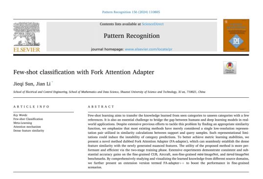 近日,數(shù)學與數(shù)據(jù)科學學院李劍教授團隊在小樣本圖像識別方面取得新進展,相關(guān)研究論文“Few-shot Classification with Fork Attention Adapter”于Pattern Recognition(PR)發(fā)表,主要工作由李劍教授和博士生孫潔琪共同完成,李劍教授、博士生孫潔琪分別為論文的第一作者或通訊作者,陜西科技大學為第一通訊單位。