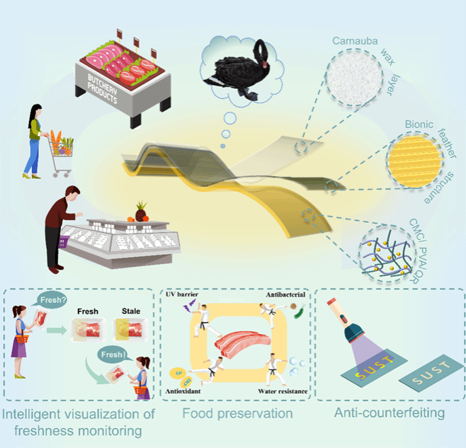 相關(guān)成果以“Swan-feathers inspired smart-responsive sustainable carboxymethyl cellulose/polyvinyl alcohol based food packaging film for robustly integrated intelligent and active packaging”為題發(fā)表在Nano Today, 2024, 56, 102272(IF = 13.2)上。陜西科技大學(xué)為論文第一通訊單位,輕工科學(xué)與工程學(xué)院碩士研究生趙素秋為本論文的主要完成人。