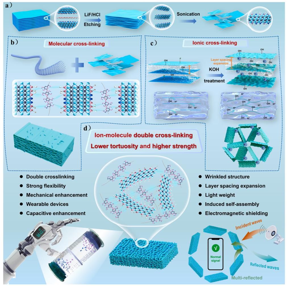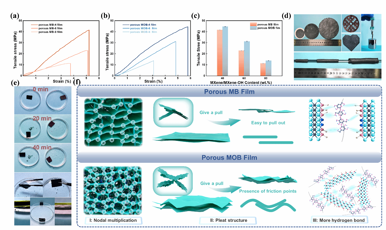 不同比例的分子交聯(lián)與離子分子雙交聯(lián)多孔MXene膜力學性能及力學提升機理圖