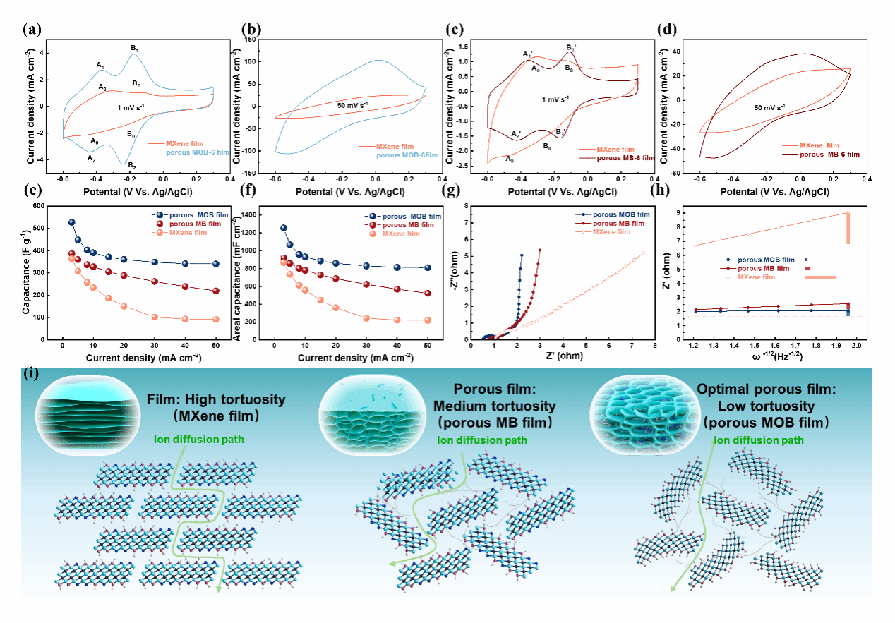多孔MXene薄膜因其多樣的孔隙結(jié)構(gòu)和豐富的表面化學性質(zhì),成為理想的柔性電子材料,在柔性儲能、電磁屏蔽等應(yīng)用方面潛力巨大。然而,其典型的問題,特別是作為柔性儲能材料時,在高電流密度下,電容性能急劇下降。主要原因在于層間結(jié)合致密,阻礙了離子的動態(tài)擴散,此外,離子擴散路徑的曲率過高,電荷傳輸過程緩慢。目前研究者致力于研發(fā)兼具大比表面積、低曲率以及優(yōu)良導(dǎo)電性和機械性能的多孔MXene薄膜,但仍然面臨諸多挑戰(zhàn)。