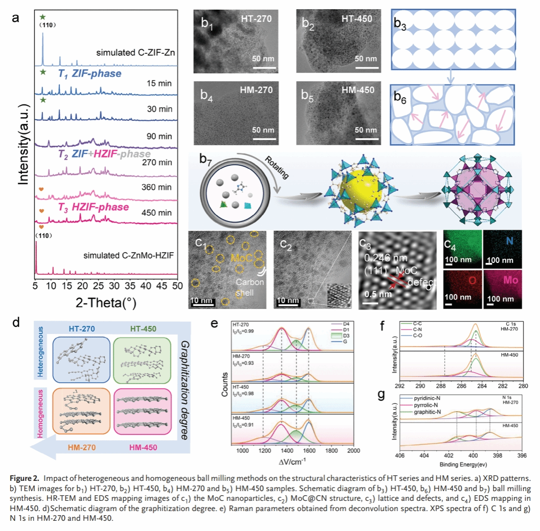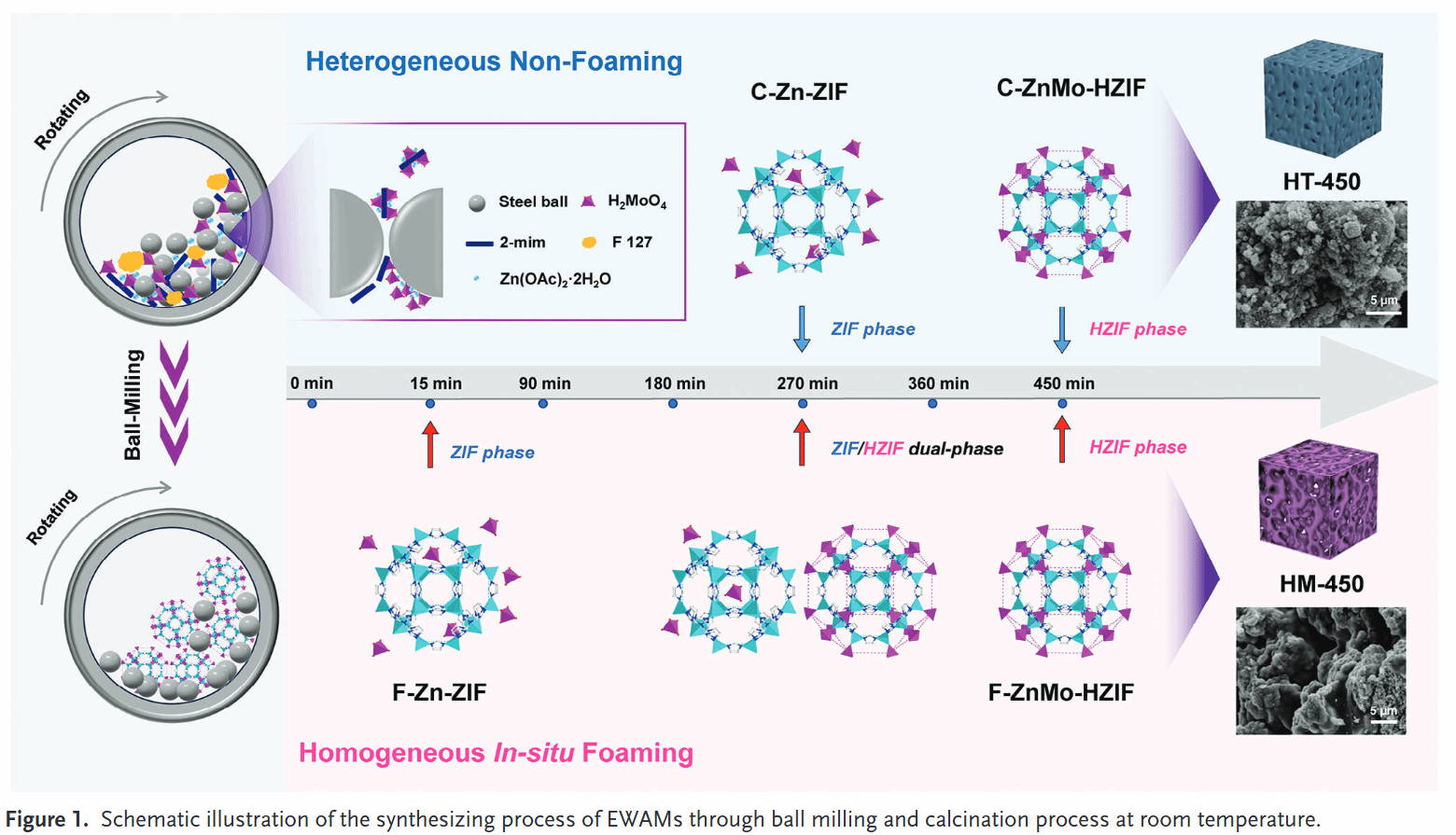 為了解決上述問題,陜西科技大學(xué)黃文歡教授團(tuán)隊(duì)開發(fā)出了一種簡便且可擴(kuò)展實(shí)施的策略,即利用ZnMo-HZIF材料,通過球磨發(fā)泡和高溫煅燒工藝,成功構(gòu)建出多氮摻雜的MoC/NC三維泡沫結(jié)構(gòu)復(fù)合材料。這項(xiàng)工作提出了關(guān)于結(jié)構(gòu)和組分對(duì)電磁波吸收性能協(xié)同效應(yīng)的新視角,并為制備輕質(zhì)高性能MOF基電磁波吸收材料提供了新方法。相關(guān)工作在《Advanced Functional Materials》期刊上以“In situ Mechanical Foaming of Hierarchical Porous MoC for Assembling Ultra-light, Self-cleaning, Heat-insulation, Flame-retardant, and Infrared-stealth Device”為題發(fā)表。