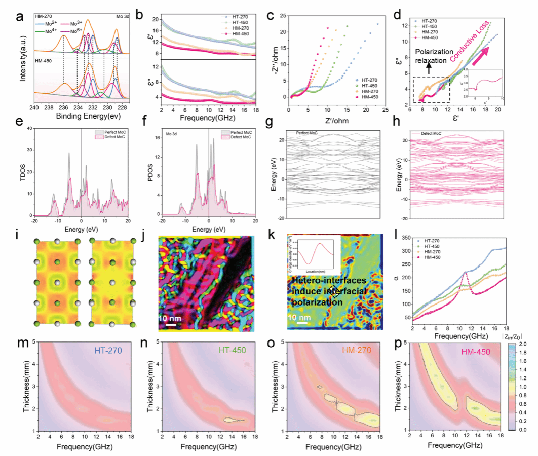 文章亮點(diǎn)包括:通過機(jī)械球磨的方法制備出泡沫結(jié)構(gòu),為材料內(nèi)部帶來了顯著的孔隙,這種泡沫結(jié)構(gòu)使得入射電磁波能夠發(fā)生多次反射,為波的傳播提供了眾多路徑;高度石墨化可以誘發(fā)高效的電子遷移和跳躍,加速電導(dǎo)率的損失和電磁波的吸收。在外加電磁場的作用下,MoC/NC異質(zhì)界面中存在的大量氮原子會(huì)導(dǎo)致更多的界面/偶極子極化;碳基質(zhì)中的鉬缺陷會(huì)破壞電荷分布平衡,促進(jìn)偶極子極化和電磁波能量的耗散。因此,優(yōu)異的電磁吸收性能來源于泡沫多級(jí)孔結(jié)構(gòu)、多個(gè)異質(zhì)界面、鉬缺陷及大量摻雜原子之間的協(xié)同效應(yīng);設(shè)計(jì)出的裝置經(jīng)過簡單的浸漬和高溫還原過程后,表現(xiàn)出優(yōu)異的疏水性、阻燃性和紅外隱身特性。