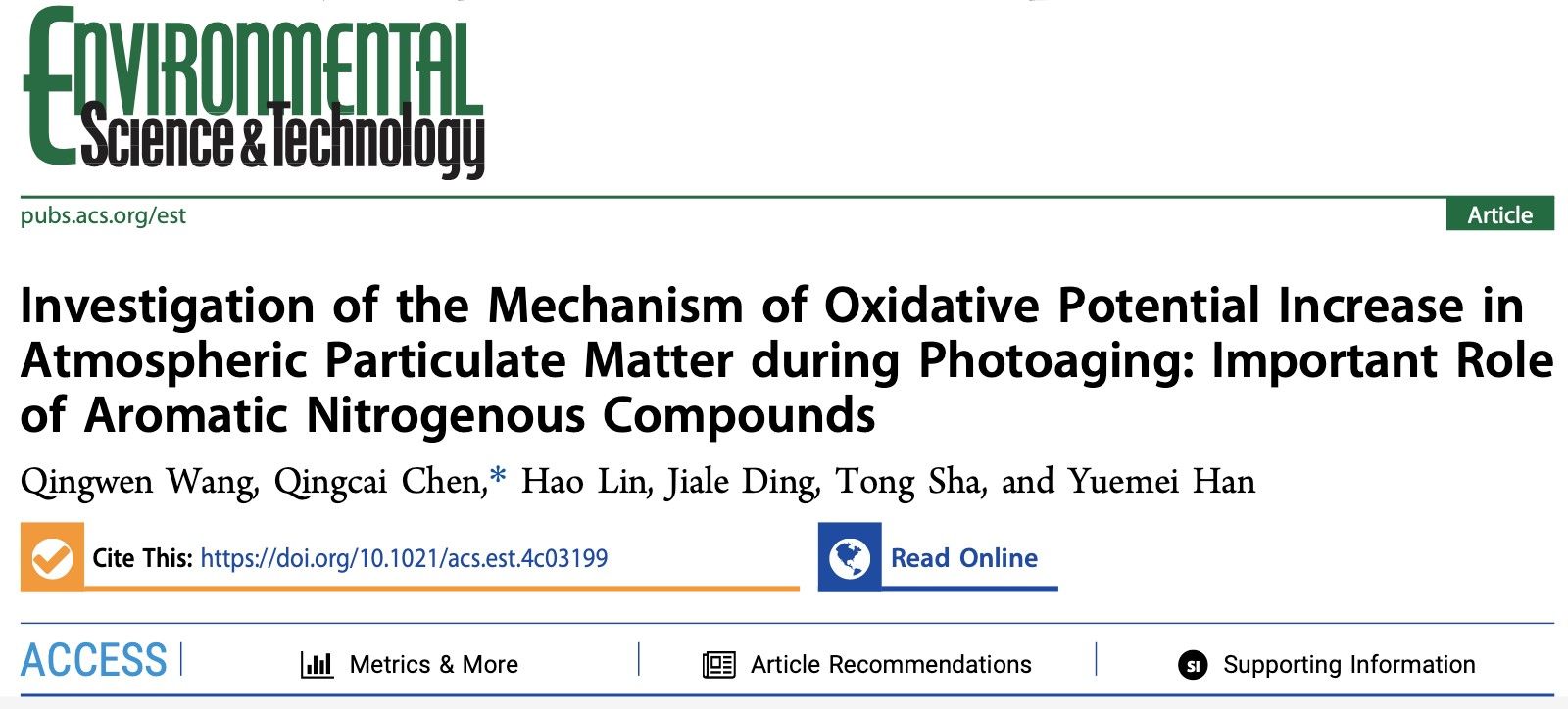 近日,環(huán)境學院陳慶彩教授團隊關于大氣污染健康風險的研究成果,在大氣領域頂級期刊《Environmental Science & Technology》(中科院一區(qū)TOP,自然指數期刊)上發(fā)表,題目為“Investigation of the mechanism of oxidative potential increase in atmospheric particulate matter during photoaging: important role of aromatic nitrogenous compounds”。陳慶彩教授為唯一通訊作者,碩士研究生王擎雯為第一作者,陜西科技大學為第一單位和唯一通訊單位。