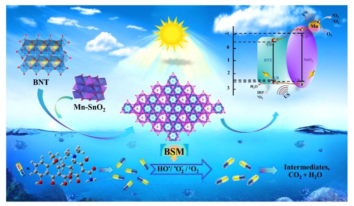 近年來(lái),壓電光催化技術(shù)作為一種新興的污染治理方法,因其能夠在外部應(yīng)力作用下促進(jìn)光催化反應(yīng)而受到廣泛關(guān)注。在這一領(lǐng)域中,鉍基復(fù)合氧化物由于其獨(dú)特的壓電特性和良好的可見(jiàn)光響應(yīng)性,引起了研究人員的廣泛興趣。然而,盡管該類(lèi)材料在催化降解中的潛力巨大,但其不同形態(tài)和結(jié)構(gòu)的優(yōu)化仍是提升催化性能的關(guān)鍵問(wèn)題。針對(duì)這一挑戰(zhàn),研究發(fā)展了一種BNT@Mn-SnO2(BSM)異質(zhì)復(fù)合材料的合成方法,該材料結(jié)合了Bi0.5Na0.5TiO3(BNT)、錳納米粒子和SnO2。通過(guò)超聲波與可見(jiàn)光聯(lián)合照射,成功地在60分鐘內(nèi)實(shí)現(xiàn)了四環(huán)素(TC)的95.4%降解,顯著優(yōu)于傳統(tǒng)催化方法。BNT的固有電場(chǎng)與錳納米粒子的等離子體特性有效促進(jìn)了電荷的分離和傳輸,進(jìn)一步拓寬了光的吸收范圍,從而提高了光催化反應(yīng)的效率。該研究為提高抗生素降解效率提供了新的思路,并為開(kāi)發(fā)更高效的廢水處理技術(shù)奠定了基礎(chǔ)。