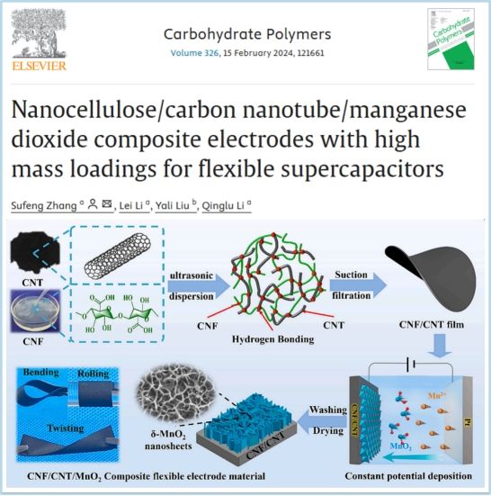 同時,研究了一種通過電化學(xué)沉積高質(zhì)量二氧化錳(MnO2)到納米纖維素(CNF)和碳納米管(CNT)導(dǎo)電膜表面的方法來構(gòu)建具有高電容和機(jī)械性能的柔性復(fù)合電極材料。相關(guān)研究成果以“Nanocellulose/carbon nanotube/manganese dioxide composite electrodes with high mass loadings for flexible supercapacitors”為題發(fā)表國際期刊Carbohydrate Polymers(文章鏈接:https://doi.org/10.1016/j.carbpol.2023.121661)。