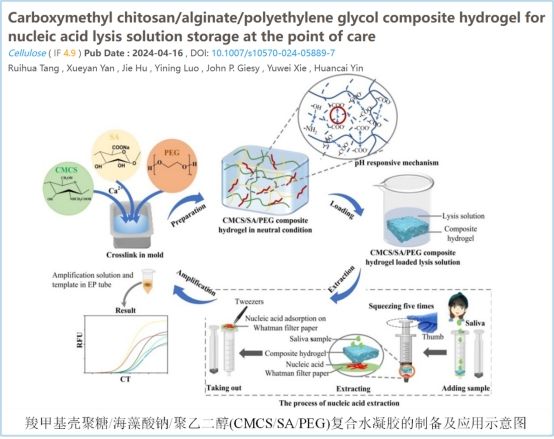 本課題組唐蕊華副教授在紙基傳感器檢測研究方面取得一定進(jìn)展,相關(guān)成果以“Carboxymethyl chitosan/alginate/polyethylene glycol composite hydrogel for nucleic acid lysis solution storage at the point of care”為題發(fā)表在Cellulose期刊(文章鏈接:https://doi.org/10.1007/s10570-024-05889-7)。本研究通過物理交聯(lián)的方法研發(fā)了一種pH響應(yīng)的羧甲基殼聚糖/海藻酸鈉/聚乙二醇(CMCS/SA/PEG)復(fù)合水凝膠,采用干浸漬法儲存樣品裂解液。結(jié)果表明:CMCS/水楊酸/聚乙二醇6000復(fù)合水凝膠具有較大的孔徑(256.58±5.58微米)、良好的濕強(qiáng)度(282.3 Kpa)、優(yōu)異的溶脹率(706.91±6.69%)、較高的吸水倍率 負(fù)載量(90.46±1.13%),降解良好容量(77.87±1.45%)和快速響應(yīng)時間 (15 s)。此水凝膠可以與濾紙一起集成于注射器中組裝成一種核酸快速提取裝置。