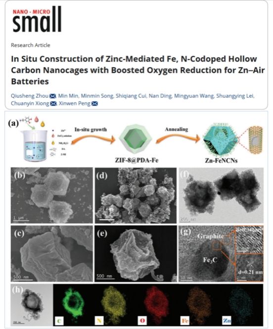 近日,本課題組周秋生副教授在設(shè)計高性能雙功能氧電催化劑并應(yīng)用于可充電鋅-空氣電池方面取得重要進(jìn)展,相關(guān)成果以“In Situ construction of zinc-mediated Fe, N-codoped hollow carbon nanocages with boosted oxygen reduction for Zn air batteries”為題發(fā)表在Small期刊(文章鏈接:https://doi.org/10.1002/smll.202307943)。本文通過熱解表面聚合鐵摻雜聚多巴胺ZIF-8多面體,合成了鋅誘導(dǎo)的Fe, N共摻雜碳納米籠(Zn-FeNCNs)。理論計算和實驗結(jié)果均表明,多面體與聚多巴胺之間的強(qiáng)相互作用促進(jìn)了高活性鋅調(diào)制的FeNx位點(diǎn)的演化和電子傳遞,從而提高了氧析反應(yīng)(OER)和氧還原反應(yīng)(ORR)的雙功能催化活性。此外,當(dāng)將該催化劑應(yīng)用于固態(tài)電池時,該器件在不同彎曲角度下表現(xiàn)出優(yōu)異的機(jī)械穩(wěn)定性和較高的往返效率。