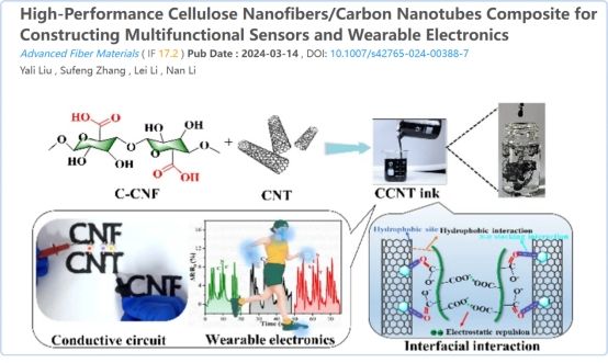 本課題組研究了一種由羧化纖維素納米纖維(C-CNFs)介導(dǎo)的水性碳納米管分散方法。利用CNFs的成膜特性和CCNT的面內(nèi)定向自組裝特性,制備出具有高導(dǎo)電性(67 S cm?1)和高力學(xué)性能(抗拉強(qiáng)度為153 MPa)的復(fù)合自支撐膜。此外,所得的生物基CCNT油墨與各種印刷工藝兼容,并適應(yīng)各種承印物。相關(guān)研究成果以“High-performance cellulose nanofibers/carbon nanotubes composite for constructing multifunctional sensors and wearable electronics”為題發(fā)表在國際期刊Advanced Fiber Materials(文章鏈接:https://doi.org/10.1007/s42765-024-00388-7)。