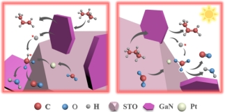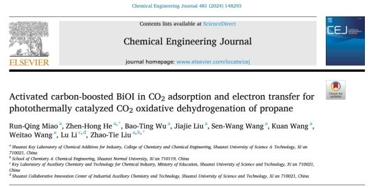 此外,為了降低CO2-ODHP反應(yīng)溫度,該團(tuán)隊(duì)開(kāi)發(fā)出Pt-GaN/SrTiO3和BiOI/AC催化劑,利用光和熱的協(xié)同優(yōu)勢(shì),在相對(duì)較低的溫度下(300 °C)實(shí)現(xiàn)該反應(yīng),首次報(bào)道了Pt-GaN/SrTiO3光熱催化CO2氧化丙烷脫氫反應(yīng),揭示出GaN和Pt分別為C-H和C=O的活化中心;同時(shí)表明CO2在光熱和熱的條件下有不同的轉(zhuǎn)化路徑;揭示了反應(yīng)機(jī)理是丙烷直接脫氫耦合逆水煤氣反應(yīng)。相關(guān)工作分別以“Photothermal catalytic CO2 oxidative dehydrogenation of propane over a dual functional Pt-GaN/SrTiO3 catalyst”和“Activated carbon-boosted BiOI in CO2 adsorption and electron transfer for photothermally catalyzed CO2 oxidative dehydrogenation of propane”為題在Applied Catalysis B: Environment and Energy(IF=20.3)和Chemical Engineering Journal(IF=13.4)期刊上發(fā)表。論文均以陜西科技大學(xué)為第一通訊單位,博士研究生王森望和碩士研究生苗潤(rùn)青分別為論文的第一作者,何珍紅教授和劉昭鐵教授為通訊作者。