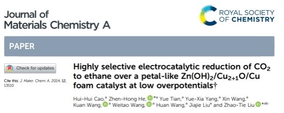 此外,開(kāi)發(fā)了一種構(gòu)建Cu2+1O電催化劑的策略,通過(guò)Zn(OH)2穩(wěn)定Cu2+1O,在泡沫銅上形成片狀結(jié)構(gòu)的Zn(OH)2/Cu2+1O催化劑,實(shí)現(xiàn)電催化CO2還原為C2H6在低過(guò)電位下(-0.3?-0.6V (vs. RHE))產(chǎn)生較高的法拉第效率(在-0.3V下,產(chǎn)生C2H6的法拉第效率高達(dá)67.8%),且該催化劑可以連續(xù)應(yīng)用至少三天,具有可接受的電催化性能。相關(guān)研究工作以“Highly selective catalytic reduction of CO2 to ethane over a petal-like Zn(OH)2/Cu2+1O/Cu foam catalyst at low overpotentials”為題發(fā)表在Journal of Materials Chemistry A(IF=10.8)期刊上,該研究對(duì)電催化CO2還原產(chǎn)生C2H6提供了一種新的策略。我校博士研究生郭攀攀、曹會(huì)會(huì)為第一作者,何珍紅教授和劉昭鐵教授為共同通訊作者,陜西科技大學(xué)為第一通訊單位,陜西師范大學(xué)為共同通訊單位。