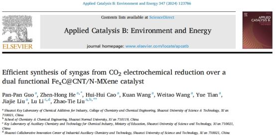 圍繞CO2資源利用,采用熱解法制備了FexC@CNT/N-MXene催化劑,用于催化二氧化碳和水共電解生成CO和H2。通過(guò)調(diào)節(jié)外加電位,產(chǎn)生具有不同H2/CO摩爾比的合成氣,其中在-1.1 V (vs. RHE)獲得等量的CO和H2,可直接用于氫甲?;虵T合成等反應(yīng)。表征結(jié)果表明,在制備過(guò)程中形成了FexC、碳納米管和摻雜N的MXene。本研究為CO2ER和HER共電解合成氣提供了一種高效的催化劑,該策略對(duì)設(shè)計(jì)其他偶聯(lián)反應(yīng)的雙功能催化劑提供思路。相關(guān)研究工作以“Efficient synthesis of syngas from CO2 electrochemical reduction over a dual functional FexC@CNT/N-MXene catalyst”為題,發(fā)表在Applied Catalysis B: Environment and Energy(IF=20.3)。