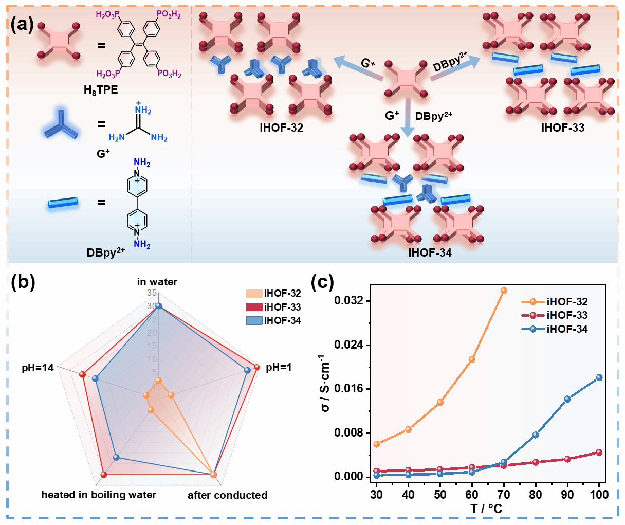 本工作中,通過多組分電荷輔助氫鍵自組裝策略,以鹽酸胍(G?HCl)、1,1?-二氨基-4,4?-聯(lián)吡啶二碘化合物(DBpy?2I)和1,1,2,2-四(4-膦酰基苯基)乙烯(H8TPE)為原料成功設(shè)計合成了兩種雙組分iHOFs(iHOF-32,iHOF-33)和一種三組分iHOF(iHOF-34)。其中,富含N和H且鏈長較短的G?HCl增強了iHOFs的氫鍵網(wǎng)絡(luò),有助于質(zhì)子的有效遷移。DBpy?2I剛性結(jié)構(gòu)為iHOFs提供了額外的支撐。iHOF-34結(jié)合了iHOF-32和iHOF-33的優(yōu)勢。通過組分間協(xié)同作用,不僅在強酸堿環(huán)境中保持穩(wěn)定性,還達到1.81 × 10?2 S·cm?1的高質(zhì)子電導(dǎo)率。此外,制備的9%-iHOF-34/Nafion復(fù)合膜的質(zhì)子電導(dǎo)率峰值為1.55 × 10?1 S·cm?1。在直接甲醇燃料電池中,峰值功率密度達到80.78 mW·cm?2,是重鑄Nafion膜的1.6倍。該研究通過精心設(shè)計的自組裝策略,實現(xiàn)了對iHOFs結(jié)構(gòu)和功能的精細調(diào)控。