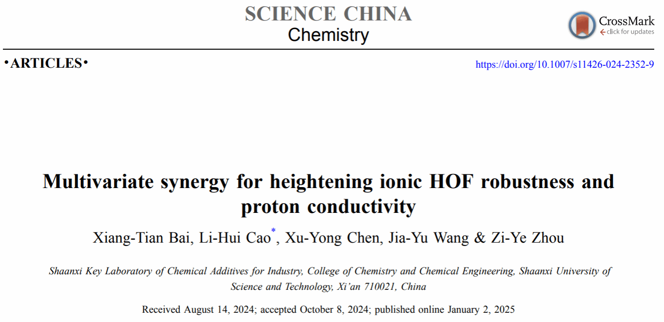 相關(guān)成果以“Multivariate Synergy for Heighten Ionic HOF Robustness and Proton Conductivity”為題,發(fā)表在Science China Chemistry(IF = 10.4)上。陜西科技大學為唯一通訊單位,化學與化工學院2022級博士研究生白向田為論文的第一作者,曹麗慧教授為唯一通訊作者。