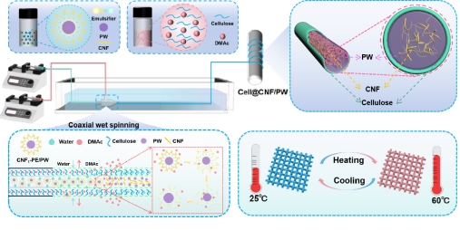 課題組提出了一種簡單的同軸濕紡絲工藝。在同軸紡絲過程中,溶解的纖維素作為纖維殼,納米纖維素(CNF)增強的石蠟(PW)乳劑作為相變核心,制備纖維素基相變纖維(PCF)及其織物(CNF1-PE/PW),使其具有優(yōu)良的機械強度、防泄漏和熱管理。CNF-PE/PW相變纖維在蓄熱和釋放方面在體溫管理方面具有很大的潛力。該工作以“Smart and robust phase change cellulose fibers from coaxial wet-spinning of cellulose nanofibril-reinforced paraffin capsules with excellent thermal management”發(fā)表在《Carbohydrate Polymers》上。23級博士生楊康為本文第一作者,段超教授為該論文的通訊作者。