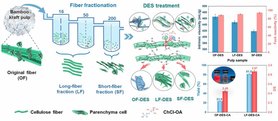 課題組提出了一種漿料纖維篩分與低共熔溶劑處理(DES)協(xié)同處理的工藝,以克服竹硫酸鹽漿(BKP)原料的不均一性和低反應(yīng)性能,將其開發(fā)成不同品質(zhì)的高純度纖維素產(chǎn)品。纖維篩分預(yù)處理篩選出更均勻的纖維組分,即短纖維(SF,薄壁細(xì)胞和細(xì)纖維)和長纖維(LF,竹纖維)。篩分-DES協(xié)同處理提供了一種有效從低等級竹紙漿升級制備高等級竹溶解漿及其衍生產(chǎn)品的方法。該工作以“Integrating fiber fractionation and deep eutectic solvent treatment to upgrade a bamboo kraft pulp into a cellulose acetate-grade dissolving pulp”發(fā)表在《Separation and Purification Technology》上。22級博士生田超超為本文第一作者,段超教授為該論文的通訊作者。