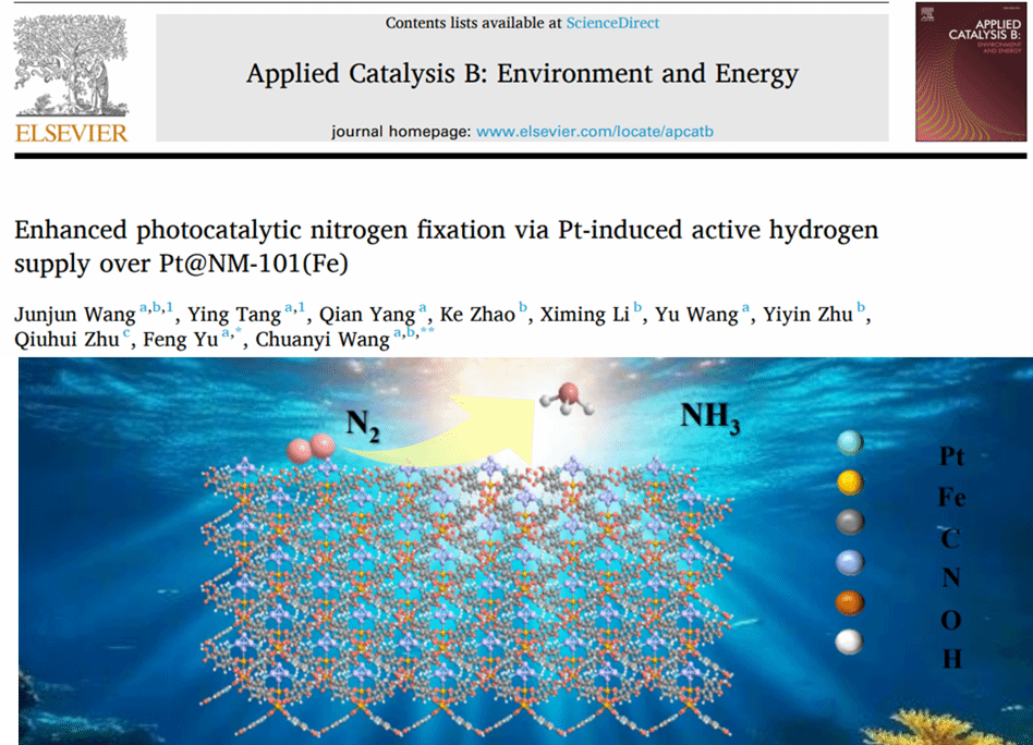 相關(guān)成果以“Enhanced photocatalytic nitrogen fixation via Pt-induced active hydrogen supply over Pt@NM-101(Fe)”為題,發(fā)表在Applied Catalysis B: Environment and Energy(IF = 20.2)上。陜西科技大學(xué)為論文通訊單位之一,環(huán)境學(xué)院2022級(jí)聯(lián)培碩士研究生王俊?。ㄊ幼哟髮W(xué))為該論文的第一作者,環(huán)境學(xué)院王傳義教授為論文通訊作者。