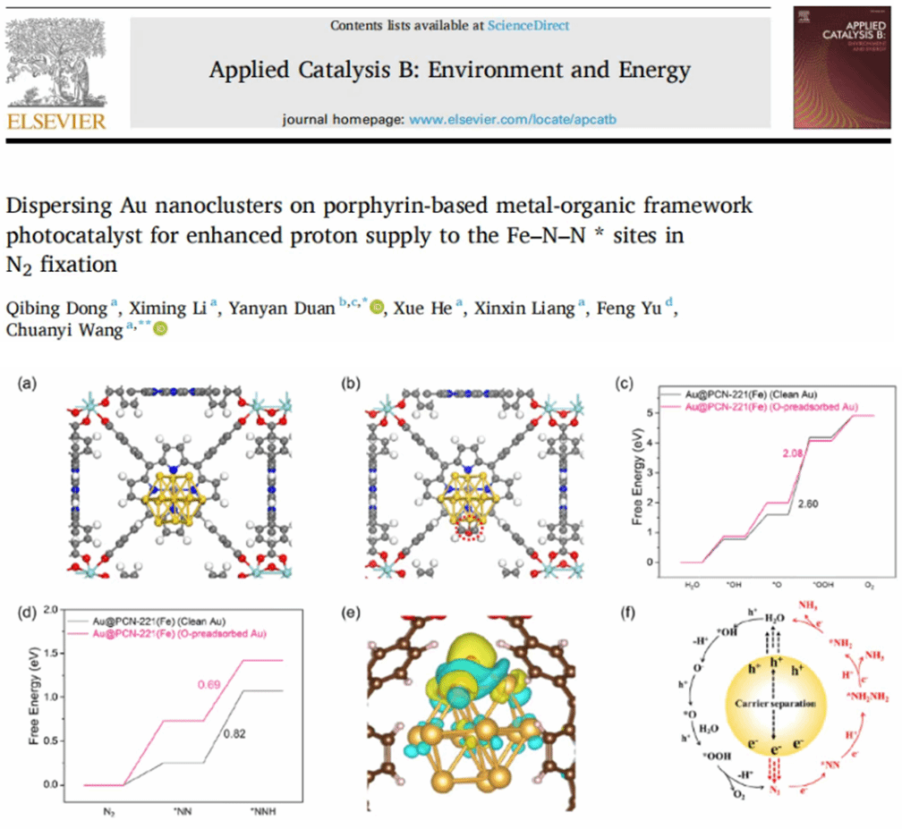 相關(guān)成果以“Dispersing Au nanoclusters on porphyrin-based metal-organic framework photocatalyst for enhanced proton supply to the Fe–N–N*?sites in N2 fixation”為題,發(fā)表在Applied Catalysis B: Environment and Energy(IF = 20.2)上。陜西科技大學(xué)為論文第一通訊單位,環(huán)境學(xué)院2021級(jí)博士研究生董奇兵為該論文的第一作者,環(huán)境學(xué)院王傳義教授為論文通訊作者。
