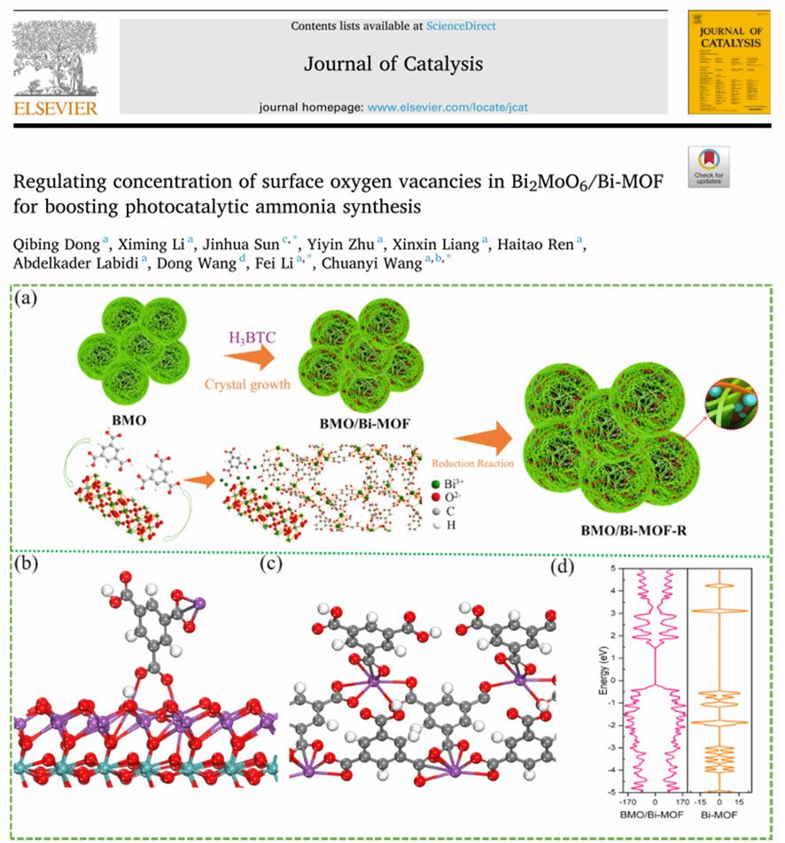 相關(guān)成果以“Regulating concentration of surface oxygen vacancies in Bi2MoO6/Bi-MOF for boosting photocatalytic ammonia synthesis”為題,發(fā)表在Journal of Catalysis(IF = 6.5)上。陜西科技大學(xué)為論文第一通訊單位,環(huán)境學(xué)院2021級(jí)博士研究生董奇兵為該論文的第一作者,環(huán)境學(xué)院王傳義教授為論文通訊作者。