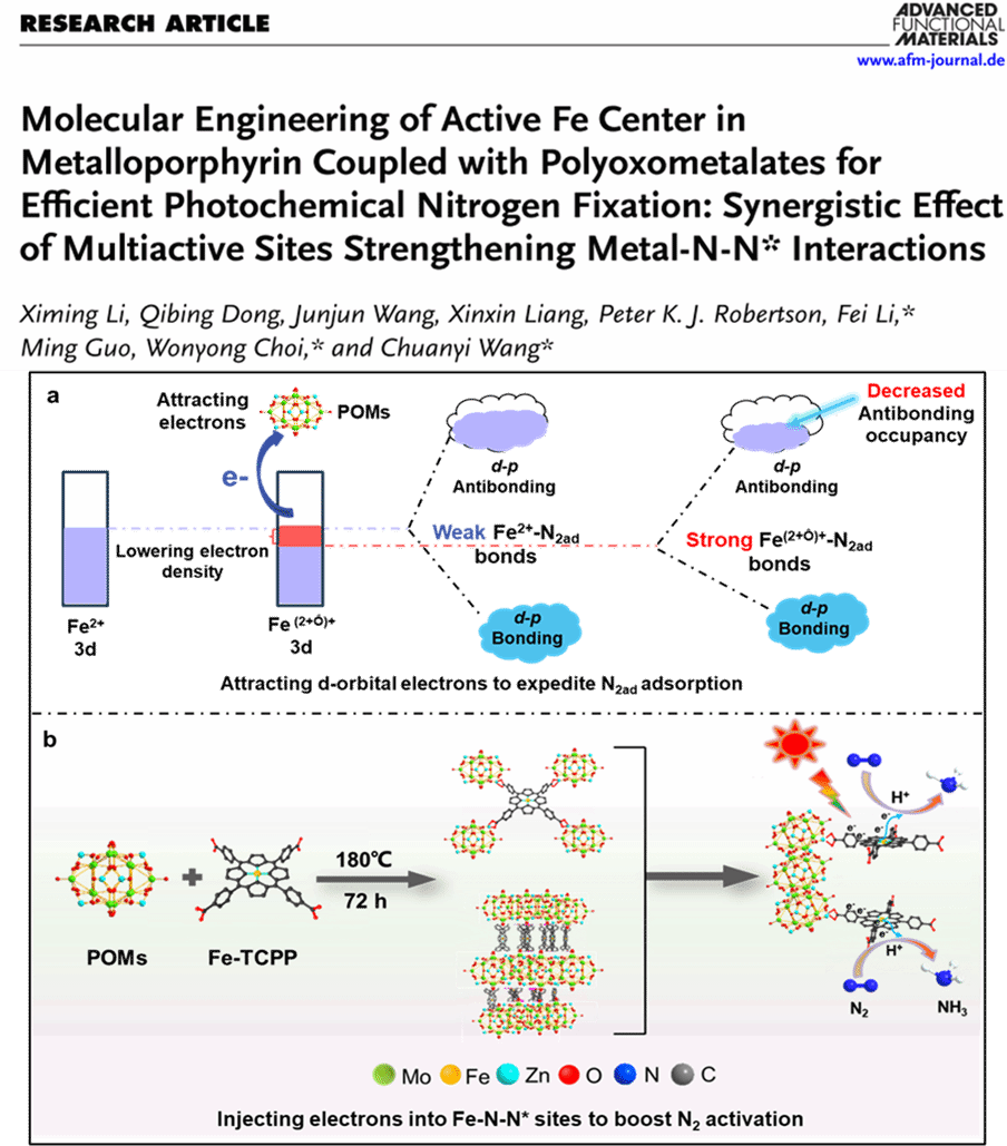 相關(guān)成果以“Molecular engineering of active Fe center in metalloporphyrin coupled with polyoxometalates for efficient photochemical nitrogen fixation: Synergistic effect of multiactive sites strengthening metal-N-N* interactions”為題,發(fā)表在Advanced Functional Materials(IF = 18.5)上。陜西科技大學(xué)為論文第一通訊單位,環(huán)境學(xué)院2021級(jí)博士研究生李喜明為該論文的第一作者,環(huán)境學(xué)院王傳義教授為論文通訊作者。