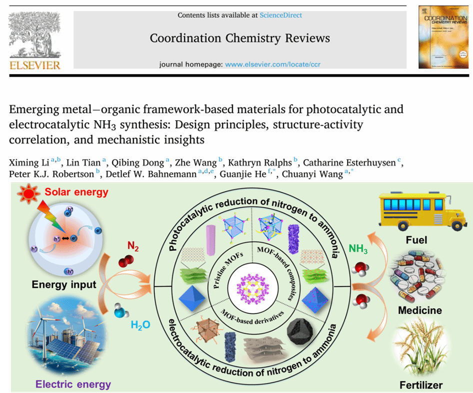 相關(guān)成果以“Emerging metal?organic framework-based materials for photocatalytic and electrocatalytic NH3 synthesis: Design principles, structure-activity correlation, and mechanistic insights”為題,發(fā)表在Coordination Chemistry Reviews(IF = 20.3)上。陜西科技大學(xué)為論文第一通訊單位,論文第一作者為環(huán)境學(xué)院2021級(jí)博士研究生李喜明,環(huán)境學(xué)院王傳義教授為論文通訊作者。