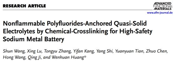 基于上述問題,近日,陜西科技大學(xué)化學(xué)與化工學(xué)院黃文歡教授團(tuán)隊(duì)設(shè)計(jì)并制備了氟修飾固態(tài)薄膜,以同時(shí)調(diào)控鈉離子傳輸和固體電解質(zhì)界面(SEI)的形成。研究表明基于該固態(tài)薄膜的鈉金屬扣式/袋式電池均表現(xiàn)出高循環(huán)穩(wěn)定性(在0.5/1 C下, 4000/2000循環(huán)后,容量分別為86.9和80.0 mAh g-1)。此外,該薄膜能夠在高溫條件下分解產(chǎn)生氟清除自由基,能夠有效阻斷電池?zé)崾Э貢r(shí)的燃燒鏈?zhǔn)椒磻?yīng),從而防止電池二次燃燒。研究成果發(fā)表于學(xué)術(shù)期刊Advanced Functional Materials,題為“Nonflammable Polyfluorides-Anchored Quasi-Solid Electrolytes by chemical-crosslinking for High-Safety Sodium Metal Battery”。